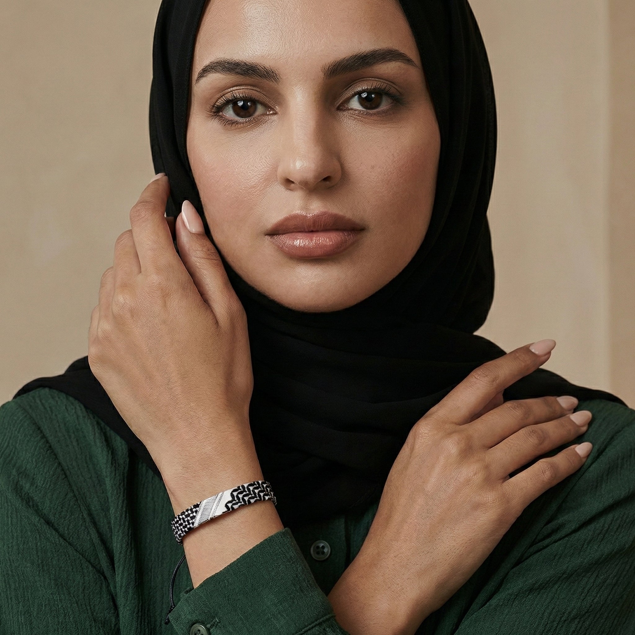The Keffiyeh Bracelet is more than just an accessory—it's a tribute to heritage and unity. Featuring intricate designs inspired by the traditional Palestinian keffiyeh, this bracelet carries the colors of resilience and hope wherever you go.